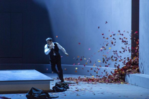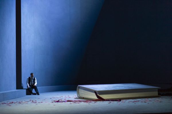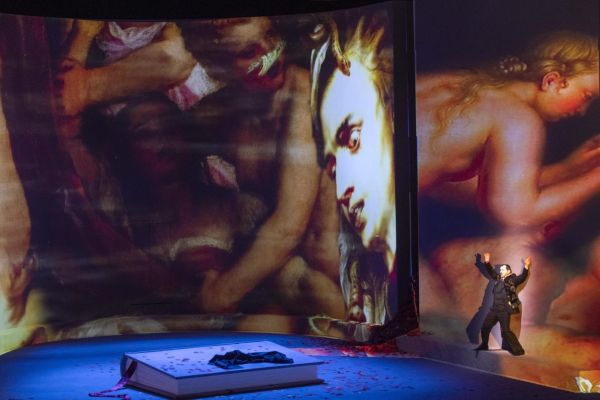 Die szenische Umsetzung ist denkbar schlicht, abgesehen von dem liegenden Buch mit einem purpurnen Leseband, das von Chandos auch mal aufgeklappt wird, hereingewehten Blättern, der Projektion barocker Aktgemälde und Licht- und Schatteneffekten steht der Sänger die ganzen 40 Minuten alleine auf der Bühne.