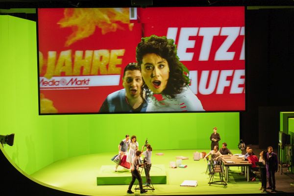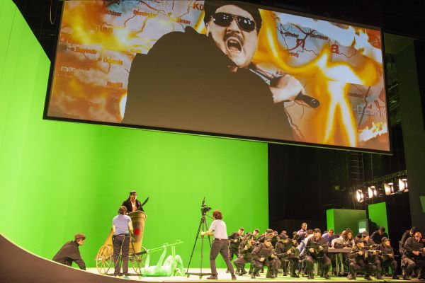 Das Publikum findet beim Betreten des Zuschauersaals einen offenen Bühnenraum mit ungewöhnlichem Setting vor. Das Orchester ist am vorderen Bühnenrand platziert, als handele es sich um eine konzertante Aufführung. Dahinter befindet sich ein großer leerer Raum ganz in hellgrüner Farbe strahlend. Die zahlreich über die Bühne getragenen Kammeras lassen vermuten, dass es sich um ein Studioset handelt, in dem mit Greenscreen-Technik gearbeitet wird. Hektischen Probengeschehen auf der Bühne vermittelt den Eindruck eines work-in-progres. Am rechten Bühnenrand ein Tisch mit ca. 10 Stühlen. Später senkt sich eine Projektionsfläche vom Schnürboden herab.