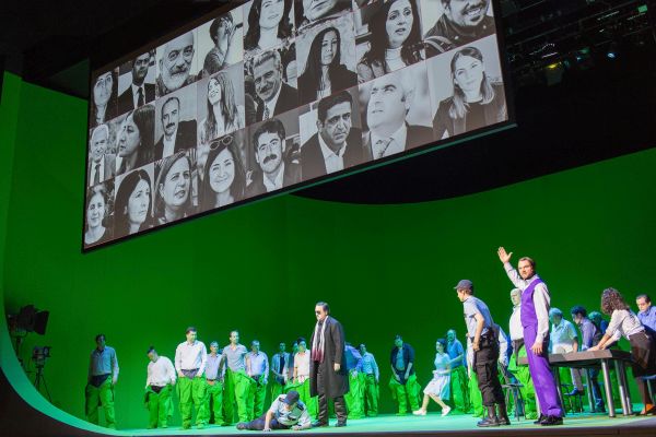 Es ist viel, was dem Publikum geboten wird. Manchmal ist es etwas zu viel. Auf der herabgesenkten Leinwand werden teils vorgefertigte Filmsequenzen gezeigt, die das Leben der Kurden in der Türkei, Auftritte des Diktators Recep Tayyip Erdoğan, Freiheitsdemonstrationen kurdischen Friedensaktivisten, Militärparaden, Machtdemonstrationen und andere Szenen zeigen. Zu anderen Zeiten wird das Bühnengeschehen im Greenscreen-Bereich oder am Gemeinschaftstisch gefilmt und projiziert. Im Bereich der Green-Box werden die gesanglichen Passagen aufgeführt, und in die verschiedensten Handlungswelten eingefügt. In den Passagen der gesprochenen Dialoge sprechen Zeitzeugen über die Erfahrungen und Hintergründe ihrer eigenen Verhaftungen in der Türkei sowie über das Leben ihrer Angehörigen, die sich immer noch in türkischer Geiselhaft befinden. Auch die deutsche Haltung zu verschiedenen politischen Fragen, so z.B. dem türkischen Völkermord an den Armeniern, dem vorgeblichen Staatsputsch, der immer wieder als von Erdogan inszeniertes Geschehen diskutiert wird, und der im die Möglichkeit gab, jede Form der Opposition zu unterdrücken. Ganz aktuell auch die die völkerrechtswidrige Annexion kurdischer Gebiete im Irak, auf die es von europäischer Seite keine ausreichende Resonanz gab. Im Gegenteil: Es entsteht weiterhin der Eindruck, Erdogan könne mit seinen Drohungen in der Flüchtlingsfrage seine Interessen entgegen jeder Rechtsstaatlichkeit auch gegenüber der Europäischen Union durchsetzen.