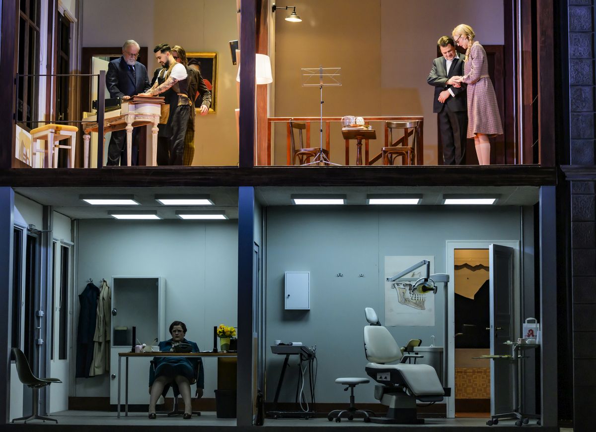 Ein Auszug aus dem Reichtum der Regieeinfälle: Almaviva holt sich das Geld fuer die ihn bei seinem Ständchen begleitenden Musiker aus einem Bankomaten, der offenbar defekt ist und die Geldscheine ohne Unterlass ausspuckt, was die schon in der Musik so freudige Reaktion der Instrumentalisten bestens zeigt. Basilios Verleumdungsarie wird per Social Media illustriert: Unbewiesene Anklagen gegen Tenor Almaviva und entsprechender shitstorm – ein Abbild dessen, was sich derzeit in den „sozialen Medien“ und darüber hinaus abspielt. Die Soldatenkluft für Almavivas Verkleidung wird nach und nach erworben, indem sie einem Klienten Figaros abgekauft wird. Überaus komisch „Un dottor della mia sorte“, während einer Wurzelbehandlung mit Rosina als Assistentin dargebracht. Im 2. Akt wird Bartolo seine Arietta „Quando mi sei vicina“ auf Deutsch singen, mit dem Hinweis à la Fischer-Dieskau. Und so geht es ungebrochen weiter bis zum Happyend, in das Bartolo nicht einstimmt, sondern vergrämt hinter einem Fenster seiner Wohnung zu sehen ist.