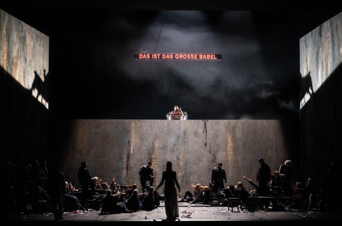 Das ist ein starkes Bild, und es wird noch übertrumpft  im zweiten Akt, wenn Nabucco seinen absoluten, fanatischen Machtanspruch ins Unermessliche steigert und sich zum Gott erklärt. Wie eine überdimensionale Krone erscheint über seinem Haupt ein riesiges Stahlgerippe, auf deren Stahlbändern in roter Leuchtschrift u.a. mit den Namen Hitler oder Stalin fanatische Menschheitsverbrecher genannt werden und Aussagen autokratischer Herrscher zu lesen sind, deren beklemmende Aktualität unter die Haut geht: „Ich bin der Vater aller Völker“, „Es gibt keinen anderen Gott als Macias“ etc. Wenn sich nach der Gotteslästerung Nabuccos zuerst die Worte der Spruchbänder in Nullen und Zahlen verwandeln, dann auch diese verschwinden und das Stahlgerippe im 3. Akt zerstört am Boden liegt und dem wahnsinnigen Nabucco nun als fragwürdige Heimstatt dient, so mag hierin ein Hoffnungsschimmer angedeutet sein, dass aus fanatischer Selbstüberhebung verursachtes verbrecherisches Handeln großer Potentaten nicht ohne Strafe bleibt. Insgesamt gelingt es Schwab in seiner eher in der Gegenwart verorteten Inszenierung überzeugend, die überzeitliche Botschaft des Stoffs zu transportieren, ohne dabei in die Falle einer kurzschlüssigen Aktualisierung zu tappen. Allerdings hätte er dem Publikum durchaus zutrauen dürfen, die politischen Botschaften auch ohne permanente didaktische Spruchbänder  entschlüsseln zu können.
