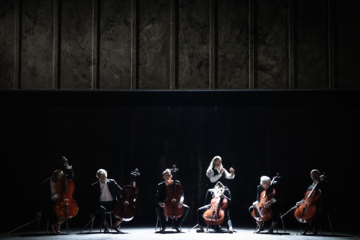 Piero Vinciguerra hat ein Einheitsbühnenbild entworfen, das den Betrachter gleichsam in einen klaustrophobischen Guckkasten mit nur schwach farbig erleuchteten Seitenwänden und umgeklappter Rückwand mit pechschwarzem Hintergrund blicken lässt. Die bedrückende Gefangenensituation der Hebräer, die zu Beginn der Oper ihr Schicksal beklagen und Jehova um Rettung anflehen – die mitgeführten Celli erinnern dabei in beklemmender Weise an die von Häftlingen in NS-Lagern erzwungene oder aber zur Selbstrettung gespielte Musik-, wird noch gesteigert, wenn Nabucco als brutaler Sieger erscheint. Denn nun wird durch Hochklappen der Rückwand die Gefängnissituation komplettiert. Nabucco thront wie ein Mafioso mit Sonnenbrille, dandyhafter rosa Hose und gleichfarbigem Hemd rauchend in ausladendem Sessel über der hochgeklappten Rückwand, wobei die Militärstiefel ähnlich wie bei seiner Tochter Agibaille den absoluten Machtanspruch repräsentieren (Kostüme: Renée Listerdal). Nabuccos Schergen zerstören nicht nur die Instrumente der Gefangenen, sie besprenkeln die Szenerie mit Benzin. Nabucco bleibt es vorbehalten, mit dem Herab-schleudern seiner brennenden Zigarette ein fürchterliches Inferno anzurichten.
