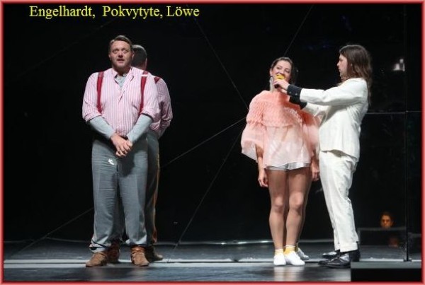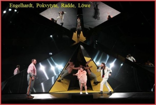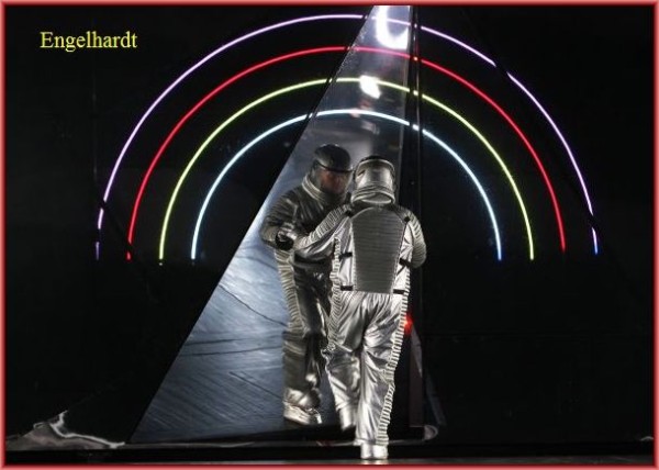 Aber: Die vielen gesprochenen Texte, die man auf der Textanlage gar nicht so schnell verfolgen kann, in englischer Sprache zu bringen, grenzt schon an Arroganz. Die Absicht, den philosophischen Gehalt mehr in den Vordergrund zu rücken, wird dadurch völlig konterkariert. Man musste sich entscheiden: Bühne oder Textanlage – entweder oder. Dies ist ein entscheidendes Manko der Produktion. Dadurch wird einiges an Wirkung verschenkt.