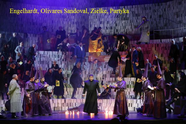 Der in Bremen geborene Regisseur Frank Hilbrich ist hier kein Unbekannter und hat am Bremer Theater bereits „Der Vetter aus Dingsda“, „The Turn of the Screw“ und den „Rosenkavalier“ inszeniert. Nun ist er in Bremen leitender Regisseur des Musiktheaters geworden. Bei seiner Sicht auf „Don Carlo“ mag eine Inspiration der Tatsache geschuldet sein, dass der spanische König Philipp II. die größte Bibliothek seiner Zeit besaß. Jedenfalls zeigt das Bühnenbild von Katrin Connan riesige, grau in grau getauchte Bücherwände. Mit ihrem stufenartigen Aufbau erinnern sie gleichzeitig an den Turmbau zu Babel. Für Hilbrich beginnt eigentlich erst mit Büchern die Zivilisation. Auf den Stufen dieser Bibliothek sieht man überall lesende Menschen. Aber Bücher sind für die Institutionen der Macht, egal ob kirchlich oder weltlich, auch eine Gefahr. Sie können deshalb brennen. „Dort, wo man Bücher verbrennt, verbrennt man auch am Ende Menschen“, hat Heinrich Heine gesagt. Hilbrich zeigt beides in der grandios und überwältigend arrangierten Autodafé-Szene, bei der eben Bücher verbrannt und Menschen so sehr von wolfsartigen, lauernden Wesen auf das Grausamste gefoltert werden, dass auch für die Zuschauer fast eine Schmerzgrenze erreicht wird. Nach dem Autodafé sind die Bücherwände dann leer.