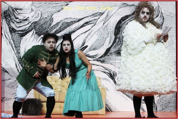 Immerhin gelingen Talke auch ein paar komödiantische Einfälle, sodass dieser „Barbiere“ letztendlich doch unterhaltsam ausfällt. Das ist natürlich auch dem komischen Talent der Sänger zu danken. Patrick Zielke etwa gibt den Doktor Bartolo in seinem zeltartigen Kostüm als trotteliges „Urviech“ mit ausgeprägter vis comica, Christoph Heinrich ist als Basilio sein Bruder im Geiste. Gesanglich können beide weitgehend überzeugen, auch wenn „La calunnia“ noch suggestiver hätte ausfallen können. Gute Figur machen auch Hyojong Kim als Graf Almaviva und Birger Radde als Figaro. Kim beeindruckt vor allem in der Arie „Cessa di piu resistere“, die ursprünglich aus Rossinis Oper „Le siège de Corinthe“ stammt, mit geschmeidiger Stimmführung und höhensicherem Tenor. Eine wunschlos überzeugende Leistung! Radde, der als Figaro oft wie ein zaubernder Magier daherkommt, gestaltet seine Partie sympathisch und mit markantem Bariton. Als Rosina wächst Nerita Pokvytyté im Laufe des Abends immer mehr in ihre Partie hinein und gibt der Figur kapriziöse Züge. Auch gesanglich kann sie sich im zweiten Akt steigern. Nathalie Mittelbach macht als Berta nicht nur durch ihr „raumfüllendes“ Kostüm nachdrücklich auf sich aufmerksam. Zoltán Melcovics und Daniel Ratchev sind Fiorello und ein Offizier.