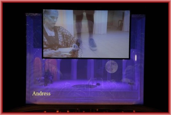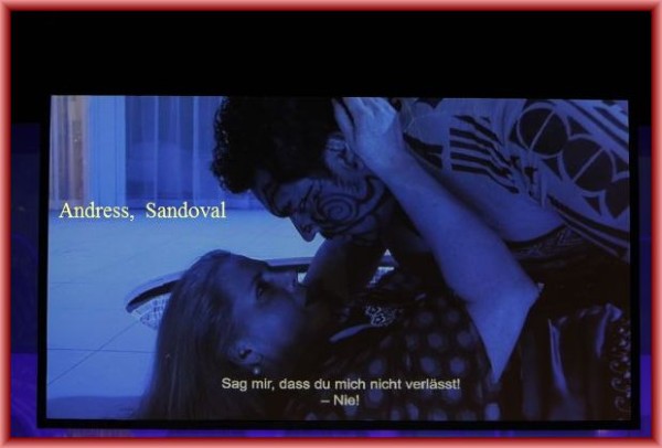 Während des gesamten „Tabarro“ ist das Geschehen auf der Bühne nur schemenhaft durch einen Gaze-Vorhang zu sehen. Auf der Bühne (Sarah-Katherina Karl) befindet sich besagter Swimmingpool (den die Sänger wiederholt in voller Montur besteigen). Puccini hat in seiner Musik aber das fließende Wasser der Seine so deutlich komponiert – da ist der Pool keine wirkliche Alternative. Zwei Live-Kameras übertragen vorwiegend die Gesichter der Sänger auf eine Leinwand. Blicke und Gesten haben natürlich große Bedeutung, aber eine ganze Oper nur als Projektion ist ermüdend. Ton und Bild sind dabei immer um Sekundenbruchteile auseinander, was auf Dauer störend ist. Auch die Textanlage versagte anfangs für längere Zeit. Immer wieder wird die Musik unterbrochen, wenn jemand aus dem Film-Team „Cut!“ und „Action!“ ruft. Dass am Ende doch ein wenig Spannung aufkommt, ist vor allem den guten Leistungen von Loren Lang als Michele, Patricia Andress als Giorgetta und Luis Olivares Sandoval als Luigi zu danken, aber nicht dem Regiekonzept.