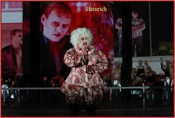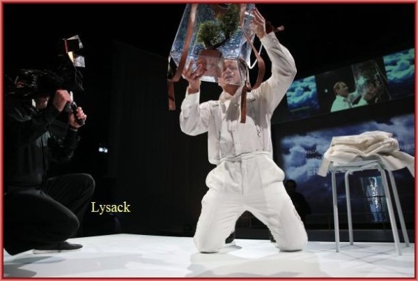 Faust hängt am Sauerstoff-Tropf: Er trägt einen Behälter mit einem Bonsai-Bäumchen auf dem Rücken und wird so mit Sauerstoff versorgt. Nach seinem Selbstmordversuch wird er in einer Klinik behandelt. Das kommt hier einer rituellen Waschung gleich. Das Personal hält Schilder mit Aussagen wie „Die ganze Welt ist mir vergällt“ oder „Einzig mein Herz bleibt kalt“ in die Höhe. Überhaupt Klinik – in dieser Irrenanstalt scheint sich zunächst alles nur in Fausts Kopf abzuspielen. Méphistophélès ist dabei das Alter Ego von Faust, die dunkle Seite in seiner Psyche. Beide sind rothaarig und ganz in Weiß gekleidet. Es ist so wie bei Jekyll und Hyde. Auerbachs Keller gibt es nicht. Die Figur des Brander (kraftvoll Christoph Heinrich) mutiert hier zu einer knallbunten, skurrilen Putzfrau in der Klinik.