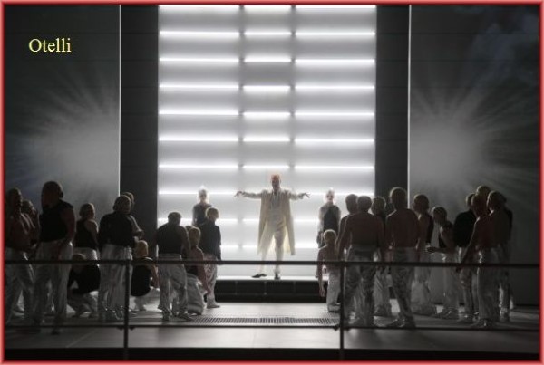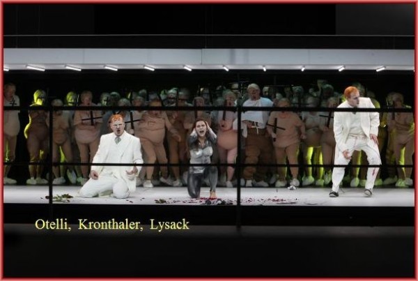 Die Bühne ist überwiegend mit weißen Laken verhängt und wird von kaltem Neonlicht geflutet. Die Ausstattung von Pia Dederichs und Lena Schmid verstärkt den Eindruck eines rituellen Mysterienspiels. Dazu gehört auch die Chorführung von Dittrich, der die Sängerinnen und Sänger mitunter auf den Seitengängen oder auf besagtem Steg auftreten lässt. Das erzeugt oft ein berückendes Klangerlebnis. Der Kinderchor tritt hier als koboldartige, dunkel gekleidete Schar von Zwergen auf, die der Welt des Méphistophélès angehören.