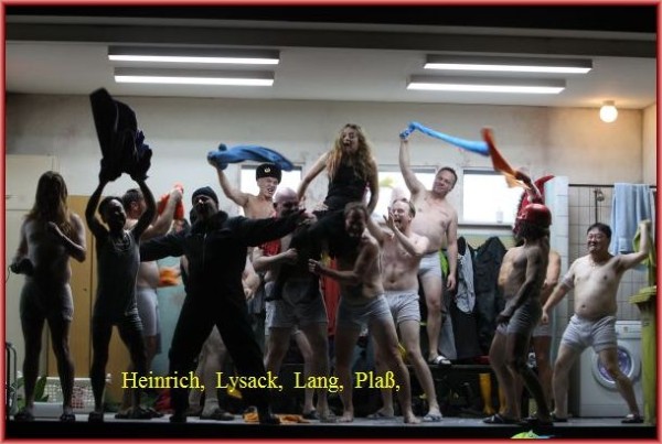 Daneben gibt es die schäbigen Umkleideräume der Arbeiter, in denen die brutale Vergewaltigung der Köchin (Hanna Plaß, die auch ein tieftrauriges Solo mit Akkordeon beisteuert) stattfindet, sowie den kalt-weiß gekachelten Waschraum, in dem Katerina und Sergej es treiben, einschließlich der „Zigarette danach“. Eine Außenansicht zeigt Schneeflocken, eine Feuerstelle, ein allegorisches Kinder-Tanzpaar (Adelina Mazakow und Michael Nuss) und eine gelbe Mülltonne, in der der ermordete Sinowi entsorgt wird. Am Schluss im Gefangenenlager verschwindet die Leinwand und gibt den Blick auf einen Turm frei, von welchem sich Katerina in den Tod stürzt und Sergejs neue Geliebte Sonjetka (Ulrike Mayer) mitreißt.