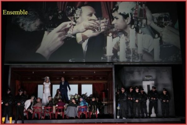 Armin Petras arbeitet in seiner insgesamt dem Werk angemessenen Regie in zwei Ebenen: Das Bühnenportal ist in gleichgroße Hälften geteilt. In der oberen werden auf eine Leinwand Videos, Fotos und Texte (von Nadja Tolokonnikowa, der Begründerin der Band Pussy Riot) projiziert, in der unteren sind mittels Drehbühne die verschiedenen Spielräume zu sehen. Die Fotos zeigen Ansichten der Industriestadt Norilsk, einem der kältesten Orte der Welt, wo die Regie die Handlung verortet hat. Die Videos von Rebecca Riedel verdoppeln das Geschehen oft in Großaufnahme oder zeigen Dinge, die auf der eigentlichen Bühne nicht zu sehen sind. Gleichwohl – es ist oft zu viel des Guten und lenkt von der durchweg spannenden Personenführung ab. Die Bühnenbilder von Susanne Schuboth sind sehr unterschiedlich und wechseln sehr häufig. Da gibt es die spießig, überladene Wohnstube, in der später auch die Hochzeitsfeier stattfindet.