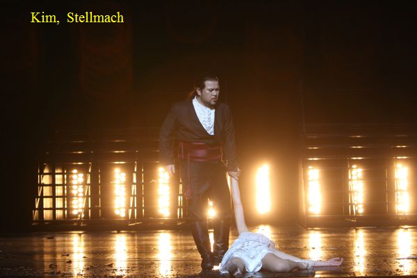 Die Partie der Lucia ist, ähnlich wie die der Norma, eine der anspruchvollsten Aufgaben im Belcanto-Bereich. Nerita Pokvytyté bewältigt sie bravourös – technisch und gestalterisch. Ihren silbrigen Sopran führt sie perfekt und virtuos durch alle Lagen. Die große Wahnsinnsarie wird in ihrer äußerst differenzierten Interpretation zum Höhepunkt der Aufführung. Hier kommt auch statt der Flöte die von Donizetti ursprünglich vorgesehene Glasharmonika (subtil von Philipp Alexander Marguerre gespielt) zum Einsatz. Gleichmaßen begeisternd ist die Leistung von Hyojong Kim als Edgardo. Sein Tenor verfügt über ein ausgesprochen schönes und farbenreiches Timbre. Er gibt der Partie Glanz und Wärme. Die kalte, herrische Attitüde seines Gegenspielers Enrico wird von Birger Radde mit martialisch auftrumpfendem Bariton punktgenau getroffen. Arturo, mit dem Lucia verheiratet wird, bekommt bei Luis Olivares Sandoval stimmliches Gewicht. Auch er wäre sicher ein guter Edgardo. Bei Christoph Heinrich erhält Raimondo, der Erzieher Lucias, dunkle und skurril-bedrohliche Züge.