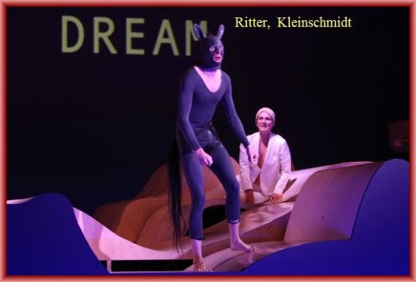 Regisseur Lehniger arbeitet wieder einmal mit Videos und Live-Kameras – eine Spezialität von ihm. Zudem begeht er die „Todsünde“, an vielen Stellen in die Musik reinquatschen zu lassen. Die textliche Bearbeitung mit Klauern wie „Kein Triangel hat je geangelt“ von Durs Grünbein ist dabei oft grenzwertig. Für Zuschauer, die den „Sommernachtstraum“ nicht kennen, dürfte die eigentliche Handlung nur schwer nachzuvollziehen sein. Und die Posse um Pyramus und Thisbe, die eigentlich von den Handwerkern aufgeführt wird, gerät hier zu einer reichlich albernen Einlage, bei der der Schwanz eines Löwen zur tödlichen Waffe wird. Charme, Erotik, Phantasie und zauberische Stimmung sind Zutaten, die dieser Inszenierung völlig fehlen. Da hilft auch die manchmal aparte Lichtregie von Christian Kemmetmüller nicht mehr viel. Selbst die Choreographie von Emmanuel Obeya beschränkt sich auf unmotivierte, zuckende Bewegungen. Am Ende ist das Kind, um das sich Titania und Oberon streiten, erwachsen. Die „Eltern“ sind alt und gebrechlich geworden, Oberon sitzt sogar im Rollstuhl. Beider Traum scheint es zu sein, sterblich zu werden. „One charming night gives more delight than a hundred lucky days“ ist auf einer Projektion zu lesen. Diese Inszenierung macht die Aussage nicht nachvollziehbar.