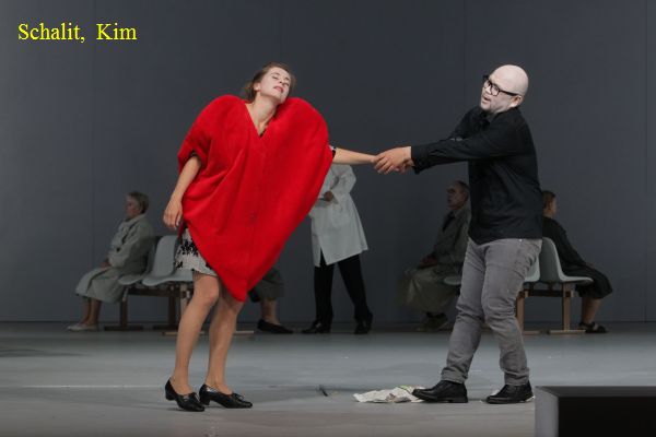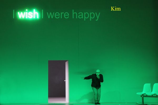 Zu Beginn ist ein grauer Saal zu sehen (Bühne von Barbara Steiner). „I wish I were happy“ steht in großen Lettern an der Wand. Menschen sitzen auf Stühlen, darunter auch Tom Rakewell. Ist es ein Wartesaal zum Glück? Bevor der erste Ton der Musik einsetzt, fällt Rakewell tot vom Stuhl. Die Handlung wird somit in der Inszenierung von Michael Talke als Rückblick entwickelt. Wie sich erst am Schluss der Oper erweist, befinden wir uns hier bereits in dem Irrenhaus, in dem das Werk endet. Es ist eine surreale Welt, die hier aufgeblättert wird. Die skurrilen Kostüme von bieder bis bizarr, von mausgrau bis zu barocker Farben- und Formenpracht machen dadurch durchaus Sinn. Anne Truelove trägt ein rotes, herzförmiges Kleid und signalisiert schon rein optisch die Wahrhaftigkeit ihrer Gefühle. Die Jahrmarktsattraktion Baba, die von Tom geheiratet wird, entpuppt sich als Affenmensch. Und Nick Shadow ist nicht nur im übertragenen Sinne eine Gestalt der Finsternis: Schwarzes Gesicht, schwarze Hände und ein pechschwarzes Gewand – eindrucksvoller kann man den Teufel nicht charakterisieren. Regine Standfuss hat viel Phantasie in ihre Kostüme investiert.