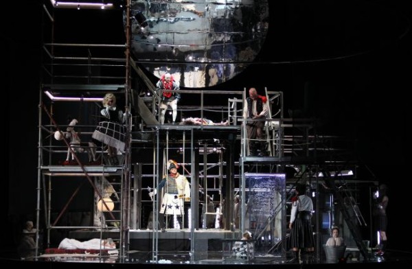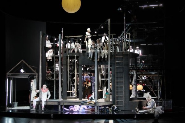Die Regie lag in den bewährten Händen von Paul-Georg Dittrich, das Bühnenbild und die Kostüme besorgten Pia Dederichs und Lena Schmid. Das durchweg dunkel ausgeleuchtete Bühnenbild wird von einer aus mehreren Stockwerken bestehenden Stahlkonstruktion eingenommen, die sich mit Hilfe der Drehbühne ständig um sich selbst dreht. Es ist eine sehr modellhafte Welt, die hier vorgeführt wird, aus der es kein Entkommen gibt. Die Handlungsträger sind vom Anfang bis zum Ende in das Innere dieses von einer kalten Sonne beschienenen Labyrinths eingeschlossen. Auf Leinwänden erfährt das dramatische Geschehen durch Jana Findeklee s Videoprojektionen eine nicht immer appetitliche, oftmals blutige Kommentierung. Hier haben wir es mit einem geschlossenen System zu tun, in dem die Emotionen leicht überkochen und in eine Katastrophe münden können. Das Fehlen jeglicher Art von Privatsphäre hat daran regen Anteil. Nirgendwo sind die handelnden Personen für sich allein. Alle Raumsegmente bestehen aus transparentem Plexiglas oder Plastikfolie. Jeder ist für jeden jederzeit sichtbar. Sämtliche Figuren sind von Anfang an auf der Szene und harren der Dinge, die da kommen werden.