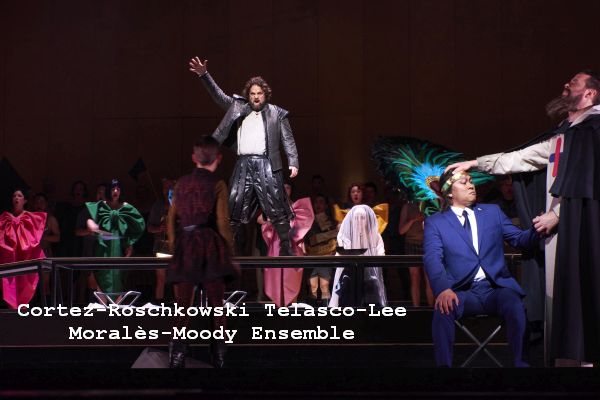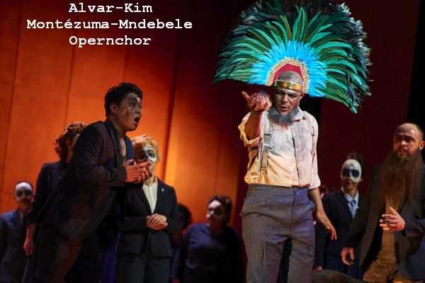 Etwas verwirrend waren gleichartige Kostüme für Spanier und Mexikaner, die Anführer in blauen heutigen Anzügen, die der Mexikaner erkennbar an grossen Federkronen, die übrigen Krieger in Unterwäsche ähnlichen Alltagsklamotten. (Miriam Grimm). Historisch wie zu ihrer Zeit gekleidet traten nur auf Cortez und sein Vertrauter Moralès, hier als katholischer Priester. Diese Partie sang Morgan Moody mit gewohnter klangvoller Stimme und Präzision. Zusätzlich mußte er noch das grosse Holzkreuz hin- und herschleppen.