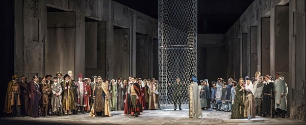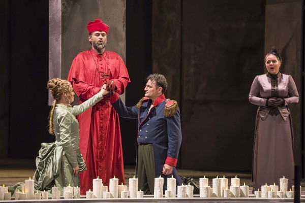 Dass man Ausgrabungen im Originalgewand zeigt, befürworte ich grundsätzlich, muss man doch bei einem Werk, dass mehr als hundertfünfzig Jahre keiner gesehen und gehört hat, anders als bei einer „Traviata“, die man an jeder Ecke gibt, nicht zwingend einen „alternativen Ansatz“ suchen. Das Produktionsteam um Marc Adam will aber augenscheinlich nicht altbacken daherkommen und ersinnt deshalb eine Teil-Verlegung der Handlung – die aber letztendlich ohne tieferen Sinn bleibt. Im deutschen Kaiserreich beginnt die Oper – und zwar dem, das dem heutigen Zuschauer wohl am meisten präsent ist. Mit Pickelhaube läuft man auf im ersten Bild, Projektionen zeigen Kriegsbilder, mutmaßlich aus dem Ersten Weltkrieg. Dazwischen werden einzelne Szenen – oder zumindest Teile davon – in mittelalterlichem Gewand gespielt oder man trägt Mode im Empire-Stil, also der Entstehungszeit der Oper. Ausstatterin Monika Gora hat die tollen Kostüme entworfen und überdies einen Einheitsbühnenraum gebaut, der die Tiefe der Bühne vollends ausnutzt und ab und an durch Prospekte verkürzt wird und deshalb als Thronsaal, Kloster und Schlafgemach gleichermaßen taugt. Die durchaus effektvollen Einfälle wie ein Meer aus Kerzen, hereinschwebende Kerker, der intensive Einsatz der Hebebühne und sogar Tierdressur schaffen schöne Bilder – kommen aber in ihrem Sinn über eine bloße Bebilderung nicht hinaus. Das reicht jedoch als würdiger Rahmen für so eine Ausgrabung.