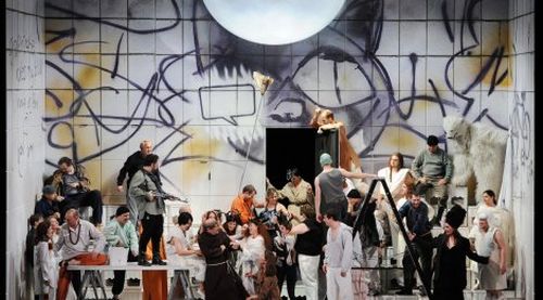 Buntschillernde Gewänder korrespondieren mit totaler Nacktheit, menschliche Befindlichkeiten mit tierischen Trieben. So erscheint u. A. als Sinnbild des typischen Russen ein Eisbär auf der Bühne. Teilweise hat man seine sieben Sinne noch zusammen, teilweise hängt man an der Flasche und frönt dem Wodka. Das einigende Verbindungsglied in diesem bunt zusam- mengewürfelten Haufen ist Nastasia. Im Folgenden wechseln die Schau- plätze. Frau Gürbaca erteilt jeder linearen Erzählweise eine klare Absage und lässt jeden Akt in einem neuen Bild spielen, wobei sie indes zeitweilig mit lockerer Hand einige bildliche Motive aus den vorhergehenden Aufzügen zitiert. So wird in der Revolutionsszene das Ambiente des ersten Aktes erneut heraufbeschworen, und der Arbeitstisch der Fürstin aus dem eisige Kälte versprühenden zweiten Akt ziert auch Nastasias ebenfalls reichlich nüchtern anmutende und im wahrsten Sinn des Wortes abgehobene Mait- ressenwohnung, die am Ende des dritten Aufzuges auf einmal in eine bedenkliche Schieflage gerät. Der tragische Ausgang des Geschehens wird so bereits unmissverständlich angedeutet. Die ausgeprägte erzählerische Spannung, die bereits bis dahin das Geschehen prägte, erreichte im vierten Akt dann ihren Höhepunkt. Hier hat die Regisseurin die Handlung kurzer- hand aus dem Wald in ein vom Satan persönlich initiiertes Varieté mit tödlichem Ausgang verlegt und dem Ganzen dazu noch äußerst geschickt einen hoch brillanten, sommernachts(alp)traumartigen Anstrich Shake- spear’scher Prägung gegeben. Das war eine ganz ausgezeichnete und höchst stimmungsvolle Mischung, die ihre Wirkung nicht verfehlte.