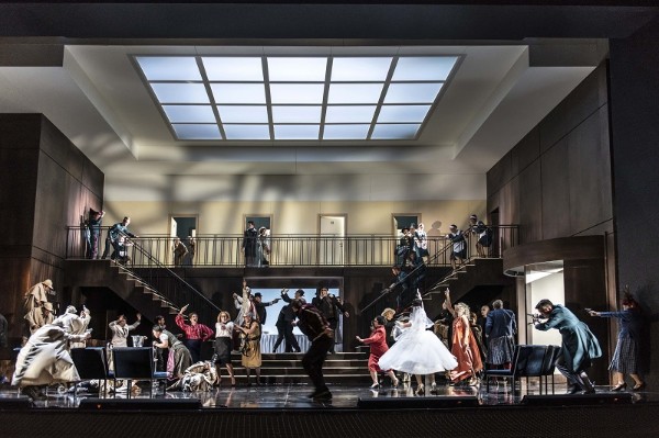 Das klingt nach einer Räuberpistole voller Potenzial und Regisseur Hendrik Müller verfolgt durchaus einen nachvollziehbaren Ansatz. In die Filmwelt der 50er Jahre will er uns entführen, bespielt die langweilige Ouvertüre, einen zähen, nicht enden wollenden Marsch, mit einem Filmintro und zitiert im Laufe des Abends zahlreiche Klassiker des deutschen Films wie Das Wirtshaus im Spessart, Im weißen Rößl oder Nonnen auf der Flucht. Die Produktion krankt allerdings an der hölzernen deutschen Originalübersetzung und den eigenen Texten aus der Feder Müllers, die vor kraftmeierischen Ausdrücken strotzen, sich in teils schwer verständlichem und darüber hinaus wenig witzigem Denglisch ergießen und von denen ich mir ein wenig mehr feinsinnigen Humor gewünscht hätte. So gerät der Abend zum Slapstick samt stetem Auf- und wieder Zuschlagen von Türen (das geht in der imposanten Hotelhalle, die Marc Weeger gebaut hat, sehr gut), auf die Bühne kotzenden Offizieren (die das Erbrochene dann auch aufzuwischen haben) und Frau Antje und Meister Propper als Reklamefiguren. Esprit findet sich allenfalls unter den Vornamen des Komponisten. Das hat mit Oper wenig zu tun und ist höchstens Boulevard-Theater eher unteren Niveaus mit ein bisschen Gesang.