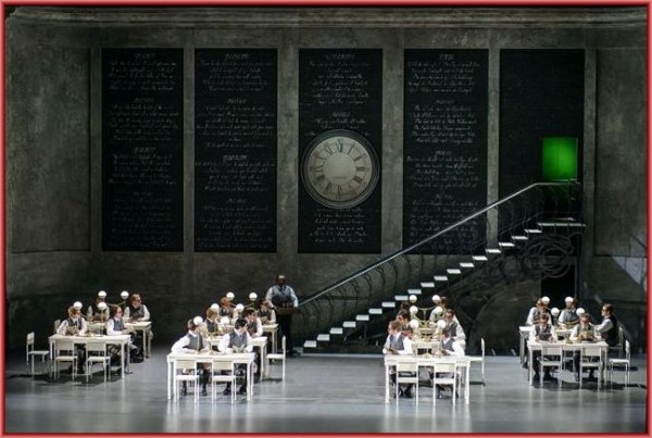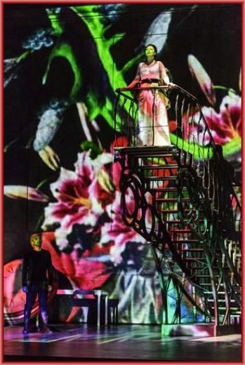 Alle Schüler führen Messer mit sich, mit denen sie bei jeder Gelegenheit drohen, Tebaldo stürzt eher in das von Romeo, als das der ihn ersticht. Im Schlafsaal der Mädchen hingegen herrscht eine in diesem Umfeld fast nicht nachvollziehbare Unschuld. Den letzten Akt verlegt der Generalintendant in die Kriegszeiten der 1940er Jahre. Aber warum? Nur um während der besonders furios orchestrierten Sturmszene so abgedroschene wie überflüssige Bilder von Luftangriffen aus dem 2. Weltkrieg einblenden zu lassen? Vielleicht doch eher, um die dann gealterte Julia, bei ihrem Schlussgesang, den er als himmelwärtigen Gang auf den zum Skelett gewordenen Stufen der Internatstreppe im ansonsten bildsprachlich verkitschten Ende inszeniert, wieder zum Mädchen werden zu lassen. Sei’s drum! Seine Personenführung fesselt da mehr und vor allem die darstellerische Qualität aller Sängerinnen und Sänger sorgt dafür, dass die Geschichte mit der stetig nach vorn treibenden Musik zu einem spannenden Krimi wird.