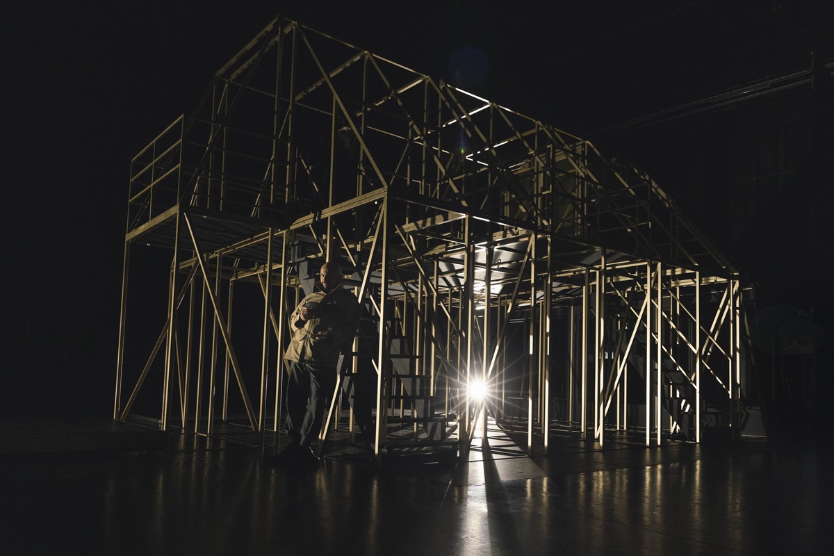 In Freiburg, wo – wie erwähnt – die Inszenierung in den Händen des hier bereits wohlbekannten Marco Štorman und der Bühnenbildnerin Frauke Löffel lag, wurde mit langem Vorlauf ein besonderes Bühnenkonzept entwickelt, in dem Zeit und Stagnation eine wichtige Rolle spielen. In der Bühnenmitte steht im ersten Akt eine fragile, transparente Hauskonstruktion (Abbildung 1), zu Beginn vom Chor in den Rollen der in Los Alamos arbeitenden Wissenschaftler, Techniker, Militärs und deren Frauen archaisch umstellt. Die ersten Sätze des Chors, trockene Forschungskommmentare, muten wie die Choreinwürfe in antiken Tragödien an: „We believed that matter can be neither created nor destroyed …“ („Wir glaubten, dass Materie weder erzeugt noch vernichtet werden kann“).