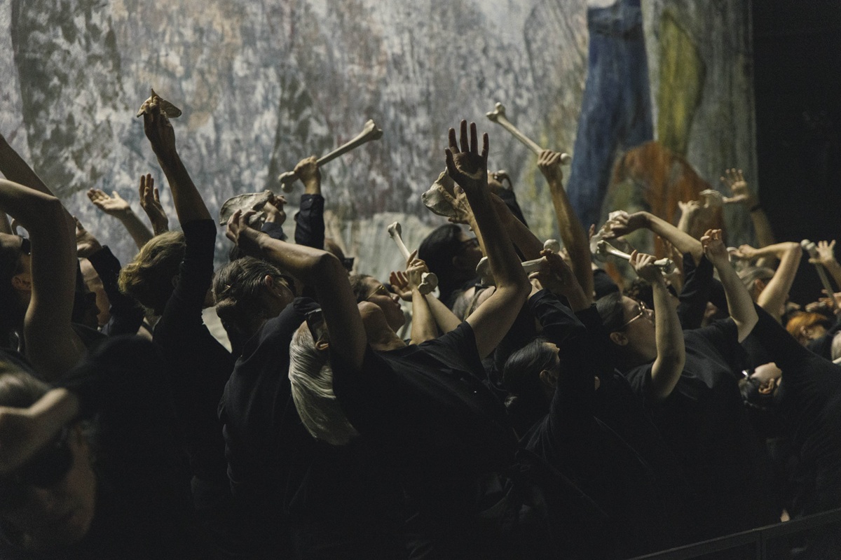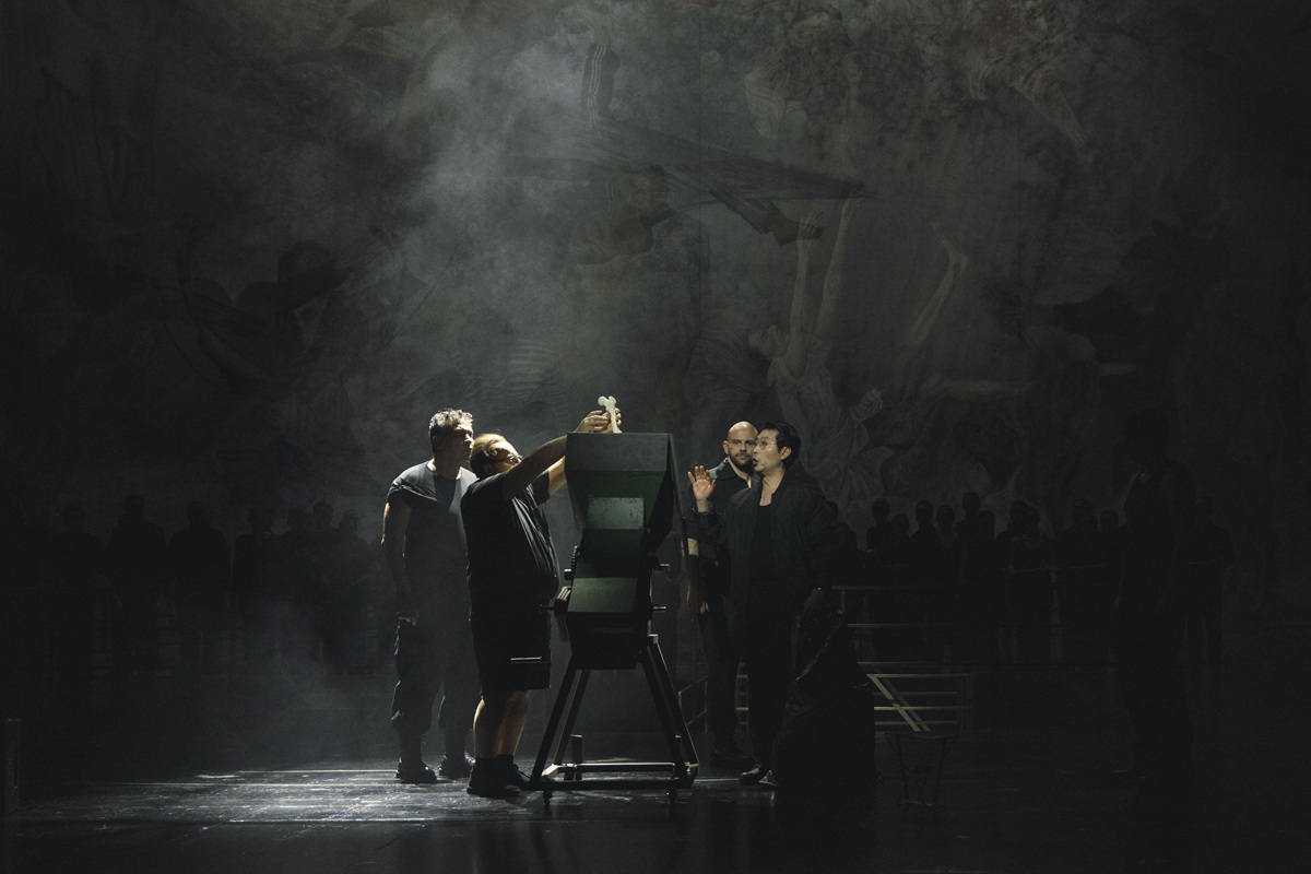 Die Handlung, für die neben Oppenheimer fünf Hauptprotagonisten stehen (überzeugend gesungen und agiert von Jin Seok Lee als Atomphysiker Edward Teller, Roberto Gionfriddo als Physiker Robert Wilson, Juan Orozco als militärischer Leiter General Leslie Groves, Jakob Kunath als Meteorologe John (Jack) Hubbard und Juyoung Mun als Leiter des Standortlazaretts, Captain James Nolan) wird nicht dialogisch entwickelt. Sie spiegelt im Gegenteil auch durch die Textsorte Isolation und zunehmendes Zurückgeworfensein auf sich selbst angesichts der herannahenden Katastrophe. Das wird besonders spürbar im zweiten Akt, als es durch ein aufziehendes Gewitter zu quälenden Verzögerungen vor der Probezündung kommt. Diese angespannte Nervosität wird geradezu zynisch konterkariert durch Requisiten wie die ein wenig hilflos wirkenden Gartengrills, die Normalität suggerieren sollen und eine in die Szene geschobene Knochenmühle, die in der vierten Szene des 2. Akts zum grauenvollen Endzeitsymbol wird (Abbildung 2).