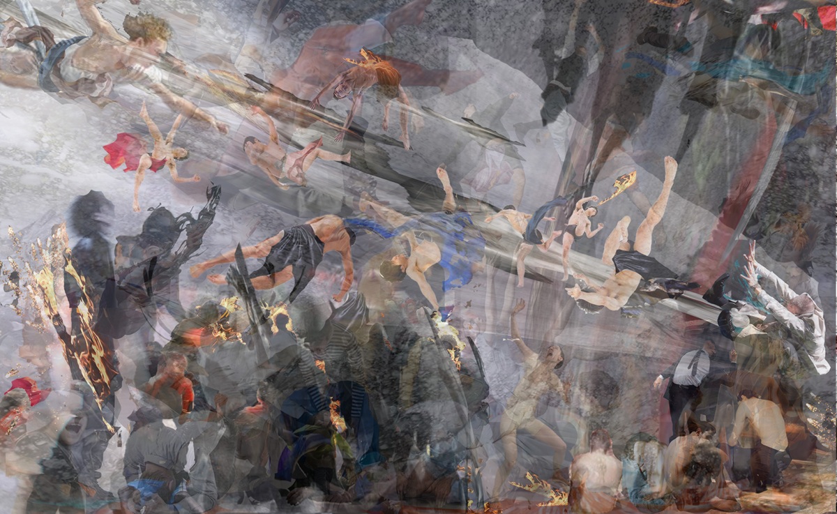Paraphrasiert wird das Gemälde Edouard Manets „L’Explosion“, das von Bühnenbildnerin Frauke Löffel adaptiert, hochvergrößert und im Malersaal von sieben Malern auf fast transparenten Gobelintüll gebracht wurde. Auf den Hängern 2 und 3 wird das Motiv zu einem dreidimensionalen Höllensturz weiterentwickelt und so „der freigestellte menschliche Körper ins Spiel“ gebracht. Frauke Löffel weiter: „Auf sich selber zurückgeworfen, vielleicht so als läge der Weltraum direkt auf der Hautoberfläche und räumliche Urkräfte wie Expansion (Explosion, Chaos), Aufwärts- und Abwärtsbewegung entfalten sich ungebremst“ (Abbildung 3).