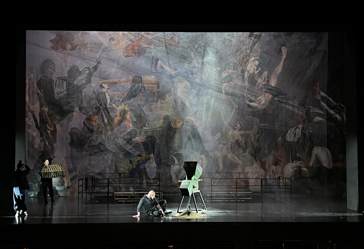 Wenn sich aber im Verlauf der ersten Szene des 2. Akts, die in ein orchestrales Interludium übergeht, nacheinander drei ca. 16 x 10 m große Prospekte senken, bekommt das Operngeschehen apokalyptische Dimensionen.
