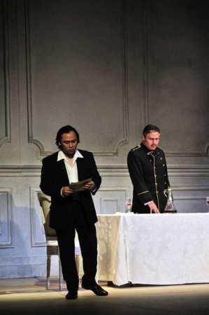 Nur Procida wirkt in seiner Entschlossenheit und Unbeugsamkeit glaubhaft, Montfort und Arrigo bleiben bei einfachster Standardgestik. Dabei wird auch eine zweite ansonsten sehr bühnenwirksame Stelle vergeben, in der sich Arrigo zwischen Vater und die dolchschwingende Geliebte stürzt. Was ein szenischer Höhepunkt sein soll, gerät zum müden Auftritt. Der Bühnenaufbau schreitet voran: Gemach des Montfort und Festsaal werden aufgebaut; ein Gefängnis als einfachste Käfigstruktur; und schließlich wieder zurück zur leeren Fläche mit Santa Rosalia, um welche herum nun das Gemetzel die Oper beendet: Procida scheint als einziger übrig geblieben zu sein und schwenkt die italienische Trikolore: historisch heißt das nichts anderes als die Annexion Siziliens durch Piemont-Sardinien 1860 (Zug der Tausend). Die Lega Nord bedauert das noch heute… Gemischte Gefühle hinterlässt letztlich diese Regiearbeit.