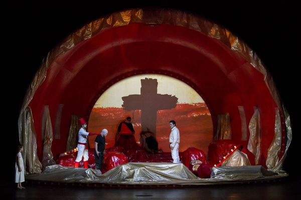 Wie sich die Bilder gleichen: Auch in der KÖNIGIN VON SABA am Abend zuvor war platinblond und schwarz angesagt gewesen. Gibt es noch ein anderes Frauenbild? Auch die Inez (sehr gut Viktoria Varga) war identisch gekleidet, den Büstenhalter als Betonung der weiblichen Attribute mussten die Damen über dem Kleid tragen, genau wie die Männer ihr Suspensorium. In der Soldatenszene räkelten sich dann drei dieser Blondinen lasziv an den roten Speeren, eine ziemlich geschmacklose Mischung zwischen Strip-Club und Golgatha. Aber eben, Kubrick liess grüssen!