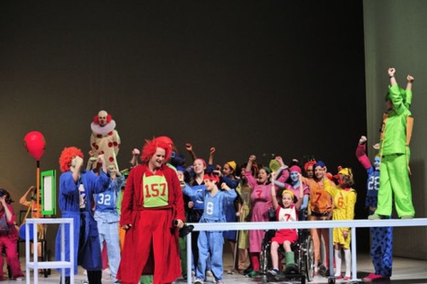 Von den Sängern vermochte in erster Linie Sharon Carty zu begeistern, die nicht nur darstellerisch durch sehr gefühlvolles Spiel alle Facetten des Oscar zog, sondern diesem mit wunderbar vollem und rundem, bestens italienisch focussiertem und emotional eingefärbtem Mezzosopran auch gesanglich ein sehr berührendes Profil verlieh. Vom Schauspielerischen her war ihr Carina Schmieger als beherzt agierende, zierliche Peggy Blue durchaus ebenbürtig. Vokal blieben bei ihrem vor allem in der Höhe noch nicht völlig ausgereiften, flachen Sopran indes noch Wünsche offen. Hier wäre mehr stimmliche Anlehnung erforderlich gewesen. Das gilt in gleichem Maße für Christoph Waltles dünnstimmigen Popcorn. Da schnitt der Einstein von Kyoung-Eun Lee schon besser ab. Die Oma Rosa hat Bollon für Vertreter des von mir aufgrund seines unnatürlichen Fistelklangs nicht zusagenden Fachs des Countertenors geschrieben. Zumindest darstellerisch machte Xavier Sabata aus seiner Rolle ein wahres Kabinettstückchen. Sein fetziges, ausgelassenes Spiel und eine gute komödiantische Ader hinterließen einen nachhaltigen Eindruck. Bei Oscars Eltern vermochte die gut gestützt und sehr profund singende Sigrun Schell (Mutter) besser zu gefallen als der etwas halsig klingende, typisch deutsche Bariton von Wolfgang Newerla (Vater). Ein markant und ausdrucksstark intonierender Dr. Düsseldorf war Ks Neal Schwantes. Solide gaben Qiu Ying Du Dr. Winterfeld und die Putzfrau und Lucia Schreiber die Sandrine. Als Kindersoli waren Anna Viola Schmieger und Coura-Lale Tall zu hören. Das zweite Elternpaar gaben Yulianna Vaydner und Stefan Fiehn. Als Klinikclown erschien Prince Fischer auf der Bühne. Oscars Briefstimme war Josias Grube. Nachhaltig empfahlen sch der von Bernhard Moncado und Thomas Schmieger trefflich einstudierte Chor und Kinderchor. Insbesondere letzterem sei an dieser Stelle ein großes Lob ausgesprochen.