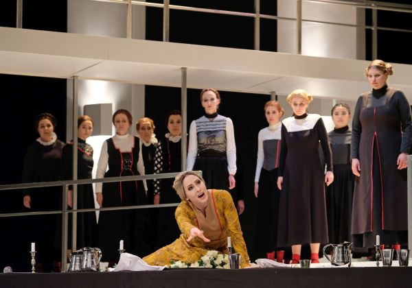 Dies schwächt die Unglaubwürdigkeit der Story, die durch den nachträglichen Eingriff der Zensur noch unglaubwürdiger geworden war, etwas ab, ohne den Inhalt wesentlich zu verfälschen. Überhaupt zeichnen sich die Regiearbeiten von Guillermo Amaya dadurch aus, dass er ohne unnötige Aktualisierungen oder andere sonst übliche Regie-Mätzchen auskommt, wenn man von den sinnfreien, überzeichnet wirkenden Aktionen der Choristen zur Ouvertüre und zum ersten Chor einmal absieht. Alles spielte sich in einer schwarz-weißen, sehr nüchternen, aber gut bespielbaren Szenerie ab (Bühnenbild: Hannes Neumaier). Allein die historisierenden Kostüme mit Farbtupfern (z.B. rote Socken der Damen) von Franziska Müller deuteten darauf hin, dass die Geschichte eben in früheren Zeiten spielt. Die schlüssige Inszenierung arbeitete die kontrastreichen Beziehungen der Hauptfiguren zueinander, die alle vom strengen Sittengesetz des Herzogs Carlo betroffen sind, und vor allem die spannungsgeladene Vater-Tochter-Beziehung sorgfältig heraus, wobei das Verhältnis der Liebenden zueinander etwas blass blieb, was auch daran lag, dass wie in der Premiere der Sänger des Oliviero ausgefallen war und doppelt ersetzt werden musste.