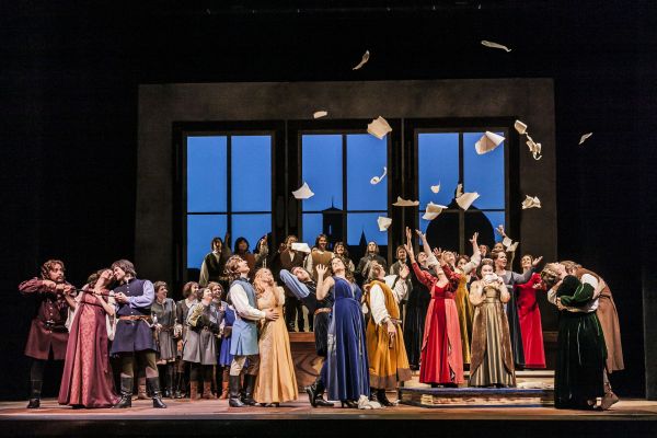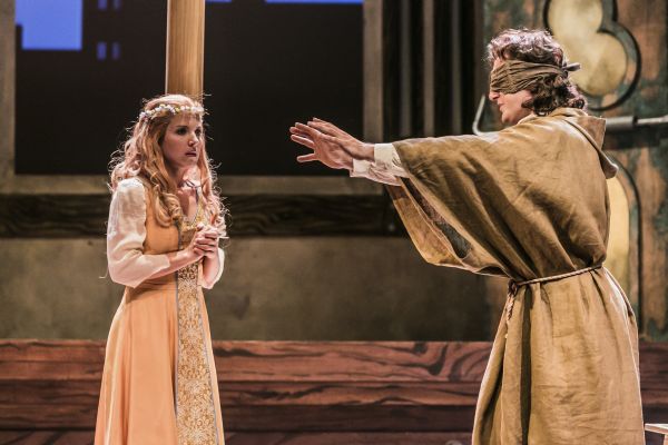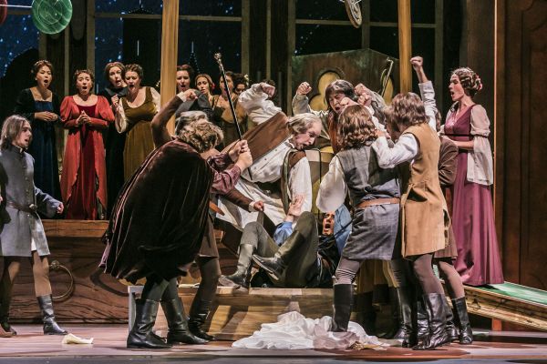 Mitten in Florenz hörten dessen mittelalterlich und farbenfroh gekleideten Bewohner (Kostüme: Elisabeth Benning), wie die neuesten Novellen Boccaccios angepriesen wurden. Der Barbier Scalza (mit polterndem Bass Levente György), der Fassbinder Lotteringhi (stimmkräftig Jan Kristof Schliep) und der abergläubische Lambertuccio (vollstimmig und witzig Uwe Tobias Hieronimi, auch in dem, von ihm selbst getexteten Couplet) suchen Boccaccio, um ihn zu verprügeln, erwischen aber mit dem Prinzen Pietro von Palermo (mit kernigem Bariton munter im Spiel Peter Kubik) prompt den Falschen. Die Frauen Beatrice (schlankstimmig Antonia Radneva), Isabella (attraktiv und mit charaktervollem Mezzo Neele Kramer) und die ältere, dennoch Liebesabenteuern nicht abgeneigte Peronella (mit abgerundetem Alt Theresa Hoffmann) versuchen erfolgreich, ihren Ehemännern die Seitensprünge zu verheimlichen. Dabei werden sie auch von Boccaccio, dem Prinzen und dem Studenten Leonetto (Manuel Oswald) unterstützt. Sie gaukeln ihnen vor, man könne von einem Zauberbaum aus erotische Szenen sehen, in Wahrheit ihre Ehefrauen im Techtelmechtel – eine auf eine Novelle Boccaccios zurückgehende Szene.