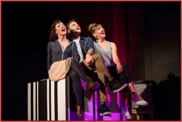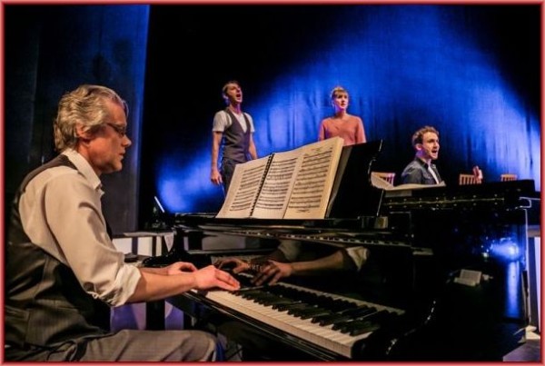 Lars Linnhoff war die Inszenierung dieser abwechslungsreichen Song-Collage anvertraut, der die vier Protagonisten lebendig auf der Vorbühne bzw. dem verdeckten Orchestergraben agieren ließ. Dort hatte Hannes Neumaier mit verschiedenen Höhenstufen eine leicht bespielbare Fläche geschaffen, die auch den direkten Kontakt zum Publikum ermöglichte. An Klavier und Elektronik leitete Andreas Unsicker umsichtig den Abend, teilweise unterstützt von E-Bass, Gitarre, Klarinette und Saxophon, Instrumente, die die Darsteller der Musical-Truppe gut beherrschten. Jürgen Brehm, Jens Krause, Sandra Pangl und Teresa Scherhag schlüpften in die unterschiedlichen Figuren und Charaktere der kleinen Szenen. Nach dem Eröffnungslied „Türen“, das die vielen Varianten einmal vorweg zusammenfasste, waren weitere Bonbons des 1.Teils „Sie liebt mich nicht“ (Brehm/Scherhag), „Ein Rendezvous“ nach Speed-Dating-Art, die erotische „Frau Spatz“ (S.Pangl), „Drei Freunde“ und „Einer der Guten“ (J.Krause).