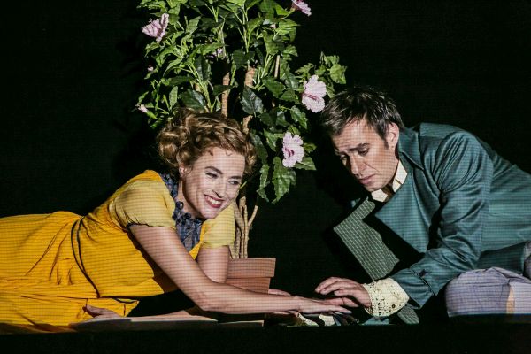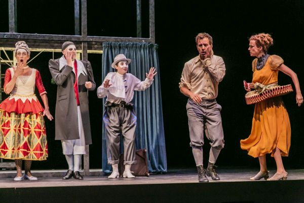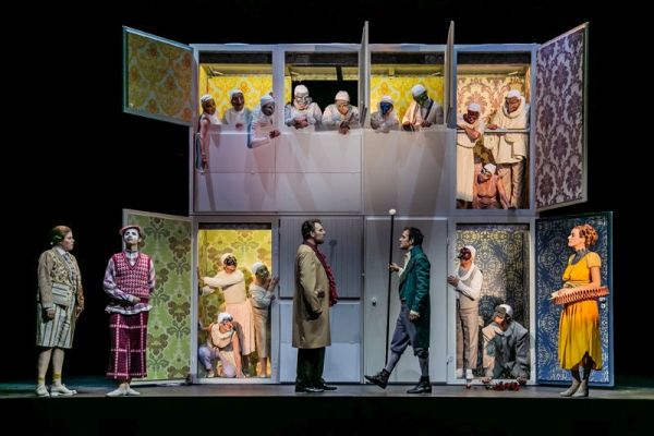 In Hildesheim ist nun die Oper mit Knigges Gesangstexten und Vulpius’ Dialogen als deutsches Singspiel zu erleben. Regisseur Wolfgang Nägele ließ sich in seinem Konzept davon inspirieren, dass die im 19. Jahrhundert durchs Land ziehenden Wandertruppen ähnlich der italienischen Commedia dell’arte hauptsächlich pure Unterhaltung eines eher einfachen Publikums bezweckten. So sah man am Ende der flott servierten Ouvertüre auf ein graues, schrankähnliches Gebilde mit Klappen und Türen, die sich öffneten und schlossen und den Blick in kleine Räume mit Blümchen-Tapete freigaben. In und natürlich besonders vor dem großen „Schrank“, der sich im 2.Akt zu einem veritablen Zimmer öffnete, gab es nun durchweg munteres Spiel aller Beteiligten, deren Kostümierung teilweise der Commedia dell’arte entlehnt waren. So trugen nur die Nebenfiguren knallbunte Kostüme und auch Masken, während Graf und Gräfin sowie Susanna und Figaro eher zeitlos gekleidet waren, wenn man von der merkwürdigen überdimensionalen „Halskrause“ um Susannas Taille einmal absieht (Ausstattung: Hannah König).