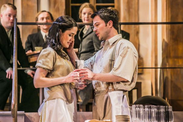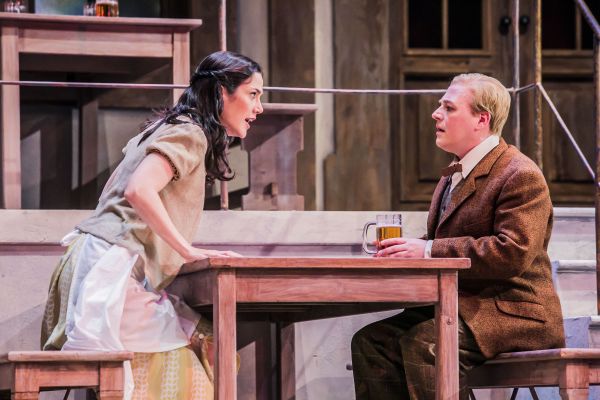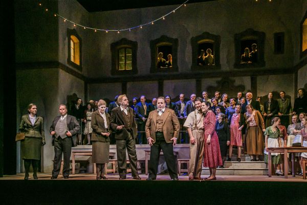 Das TfN (Theater für Niedersachsen) hat in Hildesheim wieder einmal deutlich gemacht, worauf die Erfolgsgeschichte des Unternehmens beruht, nämlich auf „Theater für alle“! Es gibt keine ärgerlich verkopften Umdeutungen oder rabiate Verlegungen in aktuelles Zeitgeschehen, für die man erst langatmige Erklärungen (oft vergeblich) im Programmheft lesen muss; die Geschichten werden einfach so erzählt, wie sie vom Librettisten und Komponisten zur damaligen Zeit gedacht waren. Friedrich Smetanas „Verkaufte Braut“ wird hier in einer merkwürdigen deutschen Mischfassung geboten, deren Urheber leider nicht erwähnt werden. In zeitlosen Kostümen wurde vor einer bühnenbreiten Wirtshaus-Fassade mit vorgebauter Biergartenterrasse agiert, die die ohnehin kleine Spielfläche zunächst noch einzuengen schien (Ausstattung: Philippe Miesch). Sie eröffnete allerdings mit vielen Türen mannigfaltige Auftrittsmöglichkeiten und –varianten, die auch schnelle Chorauftritte erlaubten. Das nutzte der Hildesheimer Oberspielleiter Guillermo Amaya mit intelligenter, stringenter Personenführung, um ein sehr lebendiges Bild dörflichen Treibens zu zeigen. Soloszenen wurden gekonnt unauffällig belebt, z.B. durch lautlos abräumende Kellnerinnen oder einzeln vorbeikommende Gäste.