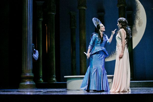 Am Pult des aufmerksamen, nicht durchweg intonationsreinen Orchesters stand wieder der erfahrene Werner Seitzer, der ein ausgesprochen feines Gespür für die richtigen Tempi hatte. Von den zahlreichen Sängerinnen und Sängern soll zuerst Martina Nawrath als Königin der Nacht genannt werden. Bereits deren erster Auftritt entsprach mit den großen nachtblauen Schärpen und der überdimensionalen Mondsichel im Hintergrund dem märchenhaften Grundduktus der Inszenierung. Wie die Koloratursopranistin den lyrischen Teil von „O, zittre nicht, mein lieber Sohn“ einfühlsam zu gestalten wusste, hatte bereits hohes Niveau, das sich im wunderbar sauber gesungenen Koloraturteil und in der Rache-Arie sogar noch steigerte. Ihr stand Daniel Eggert als jugendlicher, aber dennoch würdevoller Sarastro in nichts nach; er führte seinen gepflegten, sonoren Bass sicher durch alle Lagen.