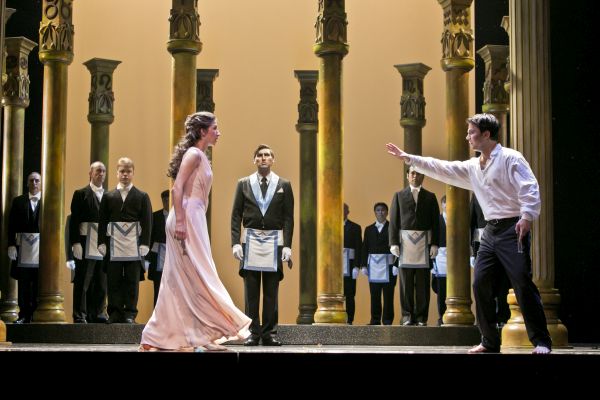 Es ist doch immer wieder erstaunlich, wie einen „Die Zauberflöte“ in seinen Bann zu schlagen vermag, auch wenn man die Märchenoper schon x-mal gesehen hat. Es liegt neben der genialen Musik Mozarts wohl an der gelungenen Mischung der humanistischen Ideale mit der kreatürlichen Menschlichkeit der Hanswurst-Ebene. Diese Faszination tritt allerdings nur ein, wenn die Inszenierung stimmt – und das kann man Regisseur Volker Vogel und seinem Ausstatter Norbert Bellen ohne weiteres bescheinigen. Da wurde nichts verfremdet oder gar in konkrete Zeiten verlegt; die Geschichte vom Liebespaar, dem so manche Prüfungen auferlegt sind (die gibt es im richtigen Leben ja schließlich auch), wurde wie ein Märchen erzählt, so wie es sich die Autoren gedacht hatten. Hier kam sogar noch etwas hinzu: Am Schluss gab es die Aussöhnung aller einschließlich der Königin der Nacht, ihrer drei Damen und Monostatos, die in den Schlusschor mit einstimmen – eine freundliche Utopie.