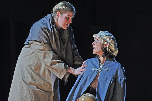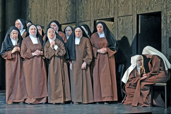 Wie der Titel der Oper verdeutlicht, lebt sie von den Dialogen der Handelnden, besonders der uniform gekleideten Nonnen, die ihre Individualität nur durch ihre Stimmen zum Ausdruck bringen können. Und das gelang in Hildesheim vortrefflich: Antonia Radneva ließ die Ängstlichkeit und Nachdenklichkeit der Blanche glaubhaft deutlich werden; ihren klaren Sopran führte sie intonationsrein durch alle Lagen. Ergreifend waren die letzten Worte der alten Priorin an Blanche, ihr qualvolles Sterben, als sie den Arzt Javelinot (Michael Farbacher) – vergeblich – um schmerzlindernde Mittel bittet, und schließlich ihre Vorhersage des Untergangs des Klosters. Das alles gestaltete Christiane Oertel als Gast von der Berliner Komischen Oper mit kraftvollem Mezzo ungemein eindringlich – ein ganz starker Auftritt. Besonders positiv fiel die junge Mezzosopranistin Neele Kramer auf, die die stimmlich und darstellerisch anspruchsvolle Partie der Mutter Maria in deren fürsorglicher Unerbittlichkeit aufs beste bewältigte. Isabell Bringmann als neue Priorin sang mit ausgeglichener Linienführung besonders stimmschön; so gaben ihre letzten Worte vor der Hinrichtung, wenn sie an Jesu Todesangst in Gethsemane erinnerte, starken Trost. Stilsicher und mit sauberer Stimmführung machte Martina Nawrath die Fröhlichkeit und Lebenslust der Schwester Constance deutlich. Seinen Tenor setzte Konstantinos Klironomos als der um seine Schwester Blanche aufrichtig besorgte Chevalier differenziert ein. In den zahlreichen Nebenrollen bewährte sich das solide Hildesheimer Ensemble einschließlich einiger Chorsolisten.