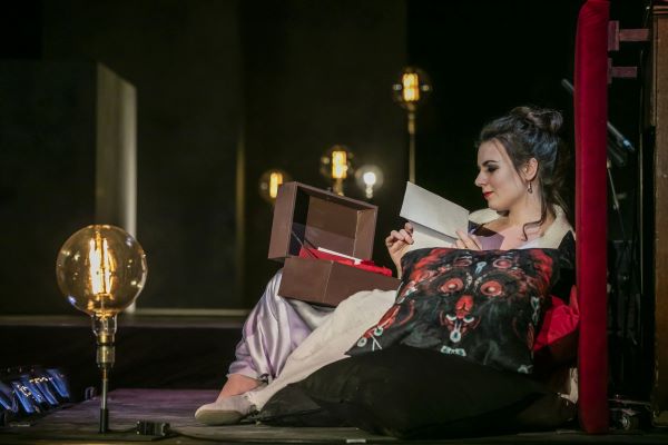 Die Neuinszenierung der serbischen Regisseurin Beka Savic in der Ausstattung von Telse Hand war aus verschiedenen Gründen reichlich gewöhnungsbedürftig. Das mit einer großen zweiflügeligen Tür und großen grauen Quadern einfach gestaltete Bühnenbild war gut bespielbar. Merkwürdig war dagegen die Kleidung der Protagonisten, die Kostüme mit gleichem, etwas exotisch anmutendem Muster trugen. Vater Germont sah mit seinem schmalen Zylinder eher wie ein Zauberer aus dem Märchen aus. Dass Flora einen Kopfschmuck aus Sektkelchen trug, sollte wohl darauf hindeuten, dass mit dieser Kostümierung die Spaßgesellschaft gemeint war, aus der Violetta ausbrechen will. Alfred trug durchgehend einen bunten einteiligen Hosenanzug, vielleicht weil ihm der Ausstieg nicht gelungen ist, was zum Schluss der Oper nun überhaupt nicht passte. Am Anfang der Oper sah man zur wunderbaren Sphärenmusik des Vorspiels Violetta in einem eleganten Ballkleid, die offenbar in Erinnerungen auf die vergangene Zeit zurückblickt, indem sie einen Brief liest, wahrscheinlich den von Vater Germont, mit dem die Rückkehr Alfreds angekündigt wird. Sobald die Musik zum Auftakt von Violettas Fest im 1.Akt erklingt, zieht sie einen Umhang im beschriebenen Muster an – und die schicksalhaften Begegnungen können beginnen. Wenn das Folgende alles Violettas Erinnerungen sein sollen, war der Schluss mit Krankenlager und Tod unbefriedigend und inkonsequent. Denn in den letzten Szenen sang sie mal aus dem Off, mal aber auf der Bühne. Dass sich Violetta und Alfred beim wunderschönen, aber tieftraurigen Schlussduett nicht umarmen dürfen, ist Corona geschuldet. Dass aber Violettas Leiche bei Alfreds Rückkehr auf einem der Quader unter weißen Tüchern quasi aufgebahrt ist, entsprach in keiner Weise dem Libretto und damit dem zu singenden Text, den man in den Obertiteln gut verfolgen konnte. Besonders ärgerlich war, dass Alfred in dem Augenblick mit dem Rücken zum Publikum am Boden vor der „Leiche“ kniete, als Violetta ihm ihre über den Tod hinausgehende Liebe erklärte, indem sie – jedenfalls nach dem Libretto – ihm ihr Medaillon gibt, dass er an eine künftige Liebe weitergeben soll.