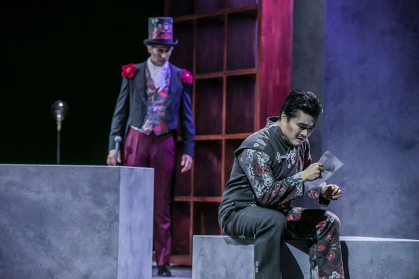 Ungewöhnlich war, dass nicht wie inzwischen allerorts üblich im italienischen Original gesungen wurde, sondern in der Fassung der deutschen Erstaufführung in Hamburg 1857, für die die Sängerin der Titelpartie Natalie von Grünhof die deutsche Übersetzung des Librettos erstellt hatte. Die Protagonisten hatten damit jedoch keine Probleme, wie überhaupt durchweg auf ansprechendem Niveau gesungen wurde. Da ist an erster Stelle Robyn Allegra Parton als Violetta zu nennen, die wie schon bei den „Briganti“ positiven Eindruck hinterließ. Wie die britische Sängerin die widerstreitenden Gefühle der todkranken Liebenden eindringlich zu gestalten wusste, gefiel trotz der nicht durchweg einsichtigen Personenregie. Ihr ausdrucksstarker Sopran erwies sich im ersten Akt als koloratur- und höhensicher, ließ im zweiten mit warmen Farben ausgestattete lyrische Töne hören und hatte besonders im Schluss-Akt schöne Piani. Dass sie öfter dazu neigt, die Töne besonders in der Mittellage von unten anzuschleifen, kann sie sich wohl noch abgewöhnen. Yohan Kim war in der Gestaltung des in Violetta ernsthaft verliebten Alfred ein wenig blass, während er seine kräftige Stimme mit dem nötigen tenoralen Strahl versah und eindrucksvoll bewies, dass er mit den Höhen der Partie keinerlei Probleme hat. Der US-Amerikaner Zachary Bruce Wilson gab den in alten Konventionen verhafteten Vater Germont, der von der Regie her nur wenig erkennen lassen durfte, wie sehr ihn Violettas Einstellung beeindruckte. Mit seinem markanten Bariton gelang es ihm, die vielen Legato-Bögen seiner Partie eindrucksvoll auszusingen. Im Übrigen erwies sich die Solidität des Hildesheimer Opernensembles: Stimmstark gab Neele Kramer die feierfreudige Flora Bervoix sowie die um Violetta besorgte Annina. Sicher und ohne Fehl erwiesen sich Julian Rohde als Gaston, Eddie Mofokeng als Baron Douphal, Jesper Mikkelsen als d’Obigny und Uwe Tobias Hieronimi als Doktor Grenvil.
