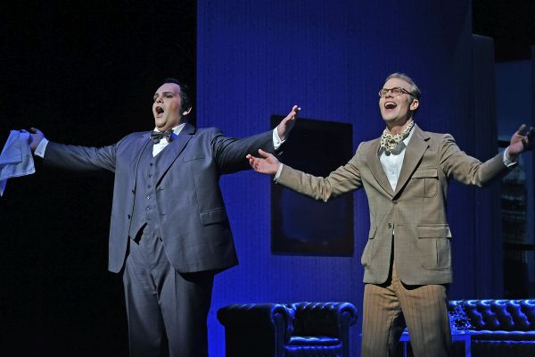 Das Ensemble ergänzten passend Jürgen Brehm als steppender Inspizient Bernie, Björn Schäffer als Liftboy und Polizist sowie Tanja Westphal, Judith Bloch und Annika Dickel als die drei Exfrauen von Saunders, die – urkomisch und stets gleich kostümiert – die Opernsponsoren vertraten. Der Opernchor des TfN ließ seiner Spiel- und Singfreude ebenfalls wieder engagiert freien Lauf und trug zu der hervorragenden Ensembleleistung stark bei. Begeisterter Applaus und Standing Ovations beendeten einen puren Unterhaltungsabend, der sicher ein Renner der Saison wird.