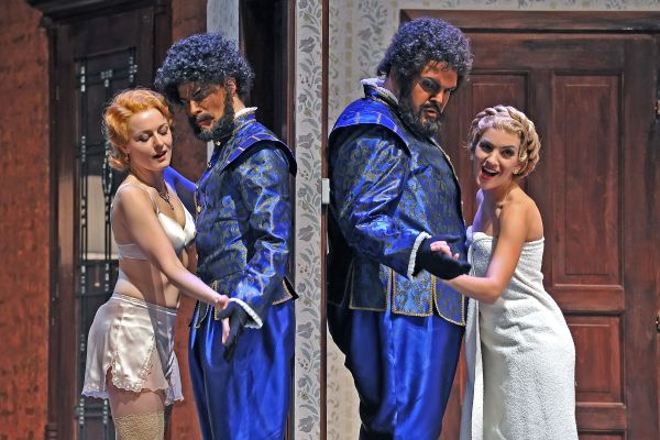 Die musikalische Leitung und Choreinstudierung lag bei Achim Falkenhausen in besten Händen: Temporeich und zündend ließ er die gut eingängigen Melodien vom ersten Ton der Ouvertüre an musizieren; das Orchester des TfN wuchs dabei über sich selbst hinaus. Jens Krause war ein köstlich schlitzohriger Henry Saunders, der schließlich noch als dritter „Otello“ die Turbulenz auf die Spitze trieb. Als Max gelang Tim Müller die Entwicklung des stets zurückhaltenden, leicht verklemmten Assistenten zum selbstbewusst einspringenden Sänger sehr gut; sein aufbauender Song „Sei du Selbst…“ half ihm auch bei dem Werben um seine geliebte Maggie (munter Magdalene Orzol), die ihrerseits eigentlich erst mit dem Gaststar eine Nacht verbringen will und das auch deutlich macht. Alexander Prosek als Tito Merelli bediente alle Tenorklischees, zunächst als Pavarotti-Verschnitt mit weißem Schal und Taschentuch; ein Höhepunkt seiner Darstellung war das Duett à la Rossini mit Max. Den temperamentvollen Eifersuchtsausbrüchen seiner Ehefrau Maria (herrlich überdreht Sandra Pangl) stand er meist hilflos gegenüber. An Merelli als Karriereförderer interessiert, umwarb die Operndiva Diana (mit witzigem Opernarien-Medley Caroline Zins) ihn mit allen ihr zu Gebote stehenden Tricks.