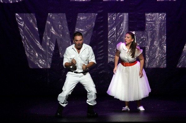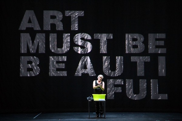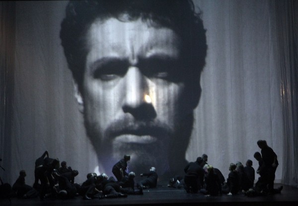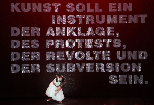 „Die Musik hat mit der Romantik des Stoffes, mit der Gefühlswärme und so weiter, so gut wie nichts zu tun.“ schrieben Zeitungen nach der Dresdner Uraufführung 1926 und ähnliches könnte man von der Hagener Inszenierung behaupten. Sicher geht es in Cardillac auch um den Trennungsschmerz, den ein Künstler von seinem Werk empfindet – Jochen Biganzoli reduziert allerdings seine gesamte Inszenierung auf diese thematische Verbindung und nutzt die Produktion, um sich grundsätzlich mit der Frage, welchen Wert Kunst hat, ob Kunst Ware sein darf und was Kunst überhaupt sein muss, zu beschäftigen. Dazu lässt er auf der leeren Bühne von Wolf Gutjahr die rundum angebrachten Prospekte mit allerhand Text anstrahlen. Mal handelt es sich um kurze Statements wie „Art must be beautiful“, mal sind es Auszüge aus einer Rede von Bundespräsident Frank-Walter Steinmeier, dann wieder darf das Publikum minutenlang Auszüge aus E.T.A. Hoffmanns Novelle mitlesen. Sicher ist die Frage nach dem Wert der Kunst heute diskussionswürdiger denn je, die bloße Aneinanderreihung von plakativen Aussagen und Forderungen allerdings verkopfen Hindemiths Werk über Gebühr. Die schroffe, energiegeladene Musiksprache des Komponisten spiegeln aus Hoffmans Erzählung vor allem die Gefühlswelt der Titelfigur wider – außer Cardillac trägt keine der übrigen Figuren überhaupt einen Namen – und mit der beschäftigt sich Biganzoli inhaltlich so gut wie gar nicht, sondern verliert sich in Konsum- und Kulturpolitikkritik. So formuliert die letzte Projektion „Wozu Kunst“, die nach de Apotheose der Titelfigur, als die Jochen Biganzoli den abschließenden Mord inszeniert, in großen Lettern erscheint, genau die Frage, die sich mir am Ende der Aufführung stellt.