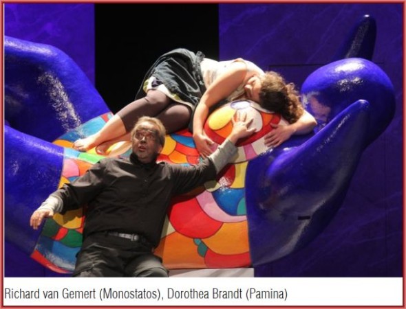 Im zweiten Teil gibt es nämlich nur noch eine große Nana im Stile von Niki de Saint Phalle, während nun die politischen Elemente in den Vordergrund rücken und die Regie Sarastros Politik immer stärker kritisiert: Während Sarastro ein salbungsvolles „In diesen heiligen Hallen“ singt, hört man die Schmerzensschreie des gefolterten Monostatos von der Hinterbühne. Im Rahmen seiner Prüfungen muss Tamino einen ganzen Aktenberg ungesehen unterschreiben. Und im Finale erkennen Pamina und (nach langem Zögern) Tamino, dass sie mit diesem Priestersystem nichts zu tun haben wollen.