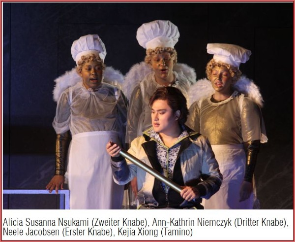 Die Besetzung ist durchwachsen: Kejia Xiong besitzt als Tamino zwar schönes Material, seine Stimme klingt aber sehr eng. Beim Papageno von Kenneth Mattice gefällt zwar der weiche Bariton, doch stört der starke englische Akzent. Ilkka Vihavainen als Sarastro besitzt eine warme Bassstimme, fokussiert diese aber nicht in den Zuschauerraum, sodass man viele Töne gar nicht richtig hört.