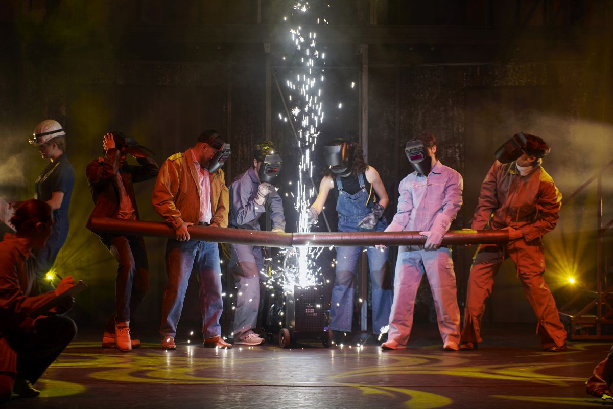 Für die Inszenierung konnte das Theater Hagen den jungen Regisseur Florian Mahlberg gewinnen, der bereits zuvor einige sehenswerte Musical-Produktionen schuf. Auch Flashdance ist eine rundum gelungene Regiearbeit, bei der gleich zu Beginn im Stahlwerk die Funken sprühen. Mit einer gelungenen Personenregie setzt Mahlberg zudem stets die richtigen Akzente. Selbstverständlich darf auch der große Wasserschwall aus dem Schnürboden unmittelbar vor der Pause nicht fehlen, der Alex Owens in der aus dem Film bekannten Pose erscheinen lässt. Norbert Bellen schuf passend zur Inszenierung eine große, dreigeteilte Drehbühne, die immer wieder für die verschiedenen Räume sorgt. Praktisch hierbei ist, dass die verdeckten Teile der Bühne immer wieder umgebaut werden können, sodass sich sehr viele verschiedene Orte abbilden lassen. Der Wechsel vom Stahlwerk zu Alex‘ Wohnung oder zu Harrys Bar gelingt schnell und flüssig. Hier gibt es sowohl die Garderobe der Tänzerinnen als auch die eigentliche Bar zu sehen. Weitere entstehende Orte sind unter anderem die Tanzschule Shipley oder die Wohnung von Alex‘ mütterlicher Freundin Hannah. Schwungvolle Choreografien von Nicole Eckenigk und passende Kostüme im Stil der 80er-Jahre von Lisa-Jasmin Tomm runden das positive Gesamtbild des Kreativteams ab.