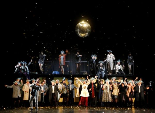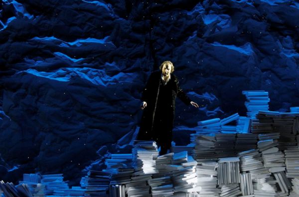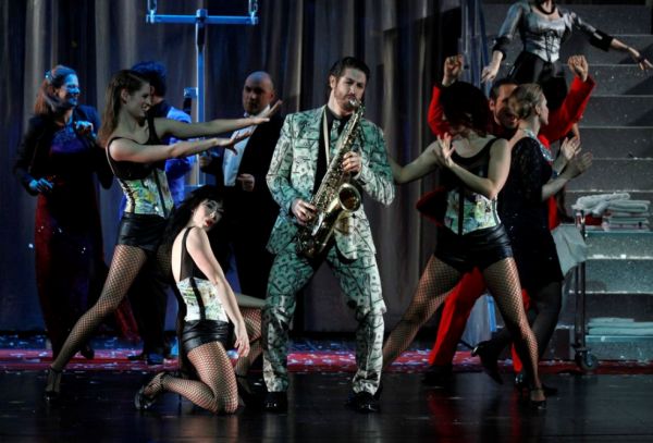 Ausstatter Jan Bammes gelingt mit seiner Gebirgslandschaft aus gestapeltem und zerknülltem Paper ein eindrucksvolles Bühnenbild, während die Hotelhallen und anderen Räume eine gewisse Beliebigkeit besitzen. Alfonso Palencia hat die drei flotten Tänzerinnen choreografiert, die Jonny umschwirren.