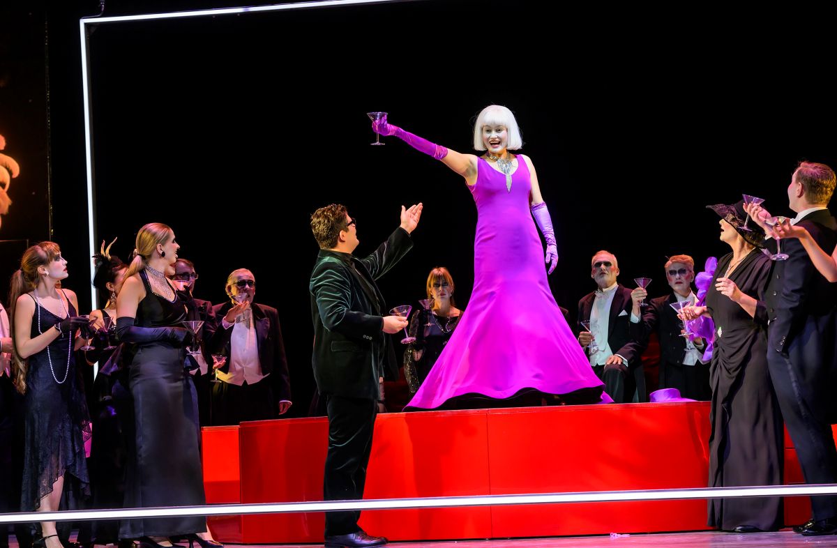 Am Ende schützt sie, nun im violetten Kleid, die sterbende Violetta vor dem Karnevalsmob. Eine Entwicklung, die ihr Vater so nicht ahnen konnte… Auf jeden Fall ist diese stumme Rolle, verkörpert von Elizabeth Pilon, eine sinnvolle Bereicherung. Violett ist bestimmt nicht ganz zufällig auch die öffentliche Kleiderfarbe der Valéry. Im zweiten Akt, der Landidylle, trägt sie ein gelbes Kleid und offene, schwarze Haare statt einer weißblonden Perücke. Auch ihr ist eine zweite Person zugedacht – ein kleines Mädchen, das (Goethe hätte übrigens „die“ geschrieben) Violetta zu Beginn auf ein sie zur Schau stellendes Podest führt und ganz am Ende sie über den Steg aus dem Stück heraus in den Zuschauersaal führt in eine offene Zukunft. Für Hannah Schnitker ist die Rolle des Mädchens hoffentlich Spiel, keine Kinderarbeit zu so später Stunde. Seine (Goethe hätte „ihre“ geschrieben) violett-weißblonde Kostümierung deutet aber an, dass Violetta das Schicksal einer Sexarbeiterin vorherbestimmt ist. Der Regisseur möchte sich am Titel „La Traviata“ – die vom Wege abgekommene – abarbeiten. Ob Violetta nun von Alfredo von einem vorherbestimmten Weg abgeleitet wird oder am Ende ihr Weg aus dem sexpositivem Partyleben herausführt und sie ihre wahre Identität findet, möglicherweise in einer von Giorgio Germont erwünschten bürgerlichen Ehe, soll am Ende offen bleiben. Dass sie sich die blonde Perücke abnimmt und ihr schwarzes Haar wallen lässt, deutet auf Letzteres hin. Oder auf eine selbstbestimmte Mischung aus beidem? Zu den weiteren Auffälligkeiten dieser Inszenierung gehören die Änderung von Annina zu Fioretta, also Violettas Freundin Flora Bervoix (schön gesungen von Hyejun Melania Kwon) im Schlussbild, sowie das kurzzeitige Einfrieren der Handlung im Partybild des dritten Aktes, wenn Violetta „Che fia? Morir mi sento!“ singt. Auch liest Giorgio Germont selbst den Brief, den er zum Ende hin an Violetta verfasst hat – da es eine Sprechszene ist, funktioniert dies problemlos.