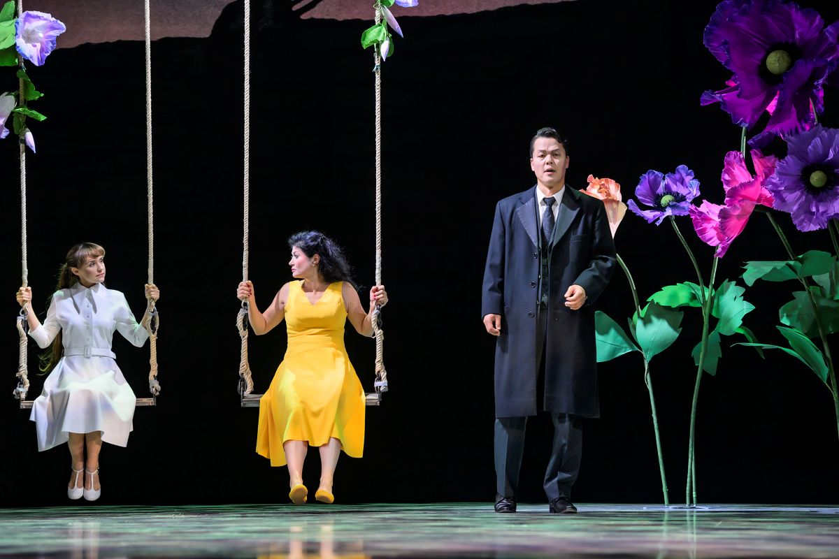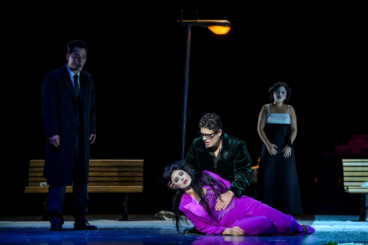 In La Traviata dominieren die Gefühle und inneren Motivationen, weshalb Äußerlichkeiten nebensächlich sind. Entsprechend ist das Bühnenbild von Norbert Bellen aufs Nötigste beschränkt. In den Partylocations deuten ein paar geschmacklose Palmen und Luftballons die Atmosphäre an. Zwei bunte Neonröhrenrahmen begrenzen anfangs wage die Spielfläche. Im Hintergrund sitzt der Chor mitsamt Extrachor auf den Stuhlreihen, auf denen in Der Goldene Drache noch das Publikum saß, und wartet auf seinen Einsatz, den er souverän und mit großer Spielfreude ausführt (Chorleitung: Julian Wolf). Übermannsgroße bunte Blumen und zwei Schaukeln vor einem schlichten Prospekt stellen den Landsitz im zweiten Akt dar. Das Schlussbild zeigt drei Bänke, auf denen die Hauptdarsteller zunächst verteilt sitzen oder liegen, und eine Straßenlaterne. Auf einen eisigblauen Boden schneit es. Das alles reicht völlig, um darin die Geschichte glaubhaft zu erzählen. Dezente Live-Videos und stimmungsvolle Ausleuchtung von Hans-Joachim Köster tragen zur szenischen Abrundung bei. Insgesamt ist es eine gefällige Inszenierung mit interessanten Aspekten, aber ohne allzu hohe Verständnisansprüche, aus den Händen eines Theaterpraktikers. Musikalisch ist sie erstklassig, und alle Ausführenden werden vom dankbaren Premierenpublikum mit großem Jubel bedacht, besonders aber Serenad Uyar und Sebastian Lang-Lessing, aber auch die kleineren Rollen können in dieser gelungenen Produktion der neuen Theaterleitung überzeugen.