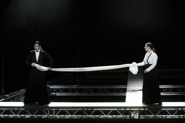 So gibt es bei ihr nicht die Geschlechternorm männlich/weiblich. Ihre Figuren sind allesamt genderneutral. Sowohl die Solopartien, als auch Chor und Ballett sind uniform und unisex gekleidet, umgesetzt von Lorena Díaz Stephens und Jan Hendrik Neidert, denen es gelungen ist, eine schwarz-weiße Kostümpracht zu entwerfen, die perfekt mit dem Bühnenbild harmoniert, welches einen Tunnel mit einem hellen Licht am Ende zeigt. Dies soll die Erfahrung mit dem Nahtod darstellen. Anspruchsvoller Minimalismus auf hohem Niveau. Die einzige Ausnahme stellt Amor/e dar. Amor ist kein Gott, sondern eine Frau aus dem Publikum, Amor/e ist die Liebe und die Liebe ist hier weiblich, nicht enden wollend, mit ein bißchen kitschigem Glitzerstaub und süß wie ein Bonbon. Deutlich gemacht durch einen Babybauch, einen Bleistiftrock und einen pinken Pullover, der einzige Farbklecks des Abends.